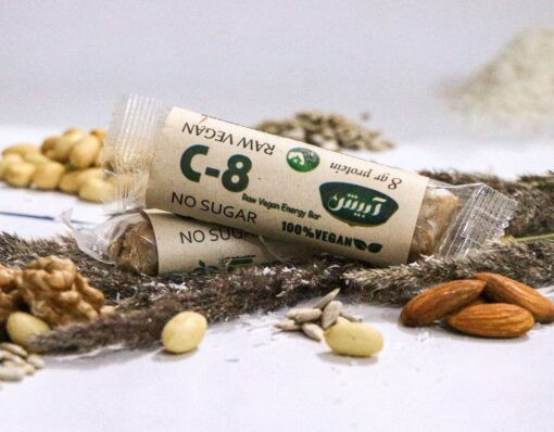 پروتئین بار C-8 یک محصول منحصر به فرد و کاملاً طبیعی است که با ترکیبات ارزشمندی مانند پروتئین کینوا، بادام زمینی، تخمه آفتابگردان، آرد جوانه گندم و شیره افرا تهیه شده است. این محصول بهعنوان یک جایگزین عالی برای پروتئین حیوانی، بهترین انتخاب برای افراد گیاهخوار و ورزشکاران است. 20 درصد از حجم این پروتئین بار را پروتئین کینوا تشکیل میدهد که آن را به یک منبع غنی از پروتئین گیاهی تبدیل کرده است.